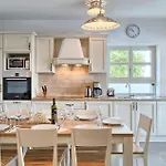Eine komplette Küche ist mit allem Notwendigen ausgestattet, darunter einer Mikrowelle, einer Kaffee-/Teemaschine und einem Kühlschrank.